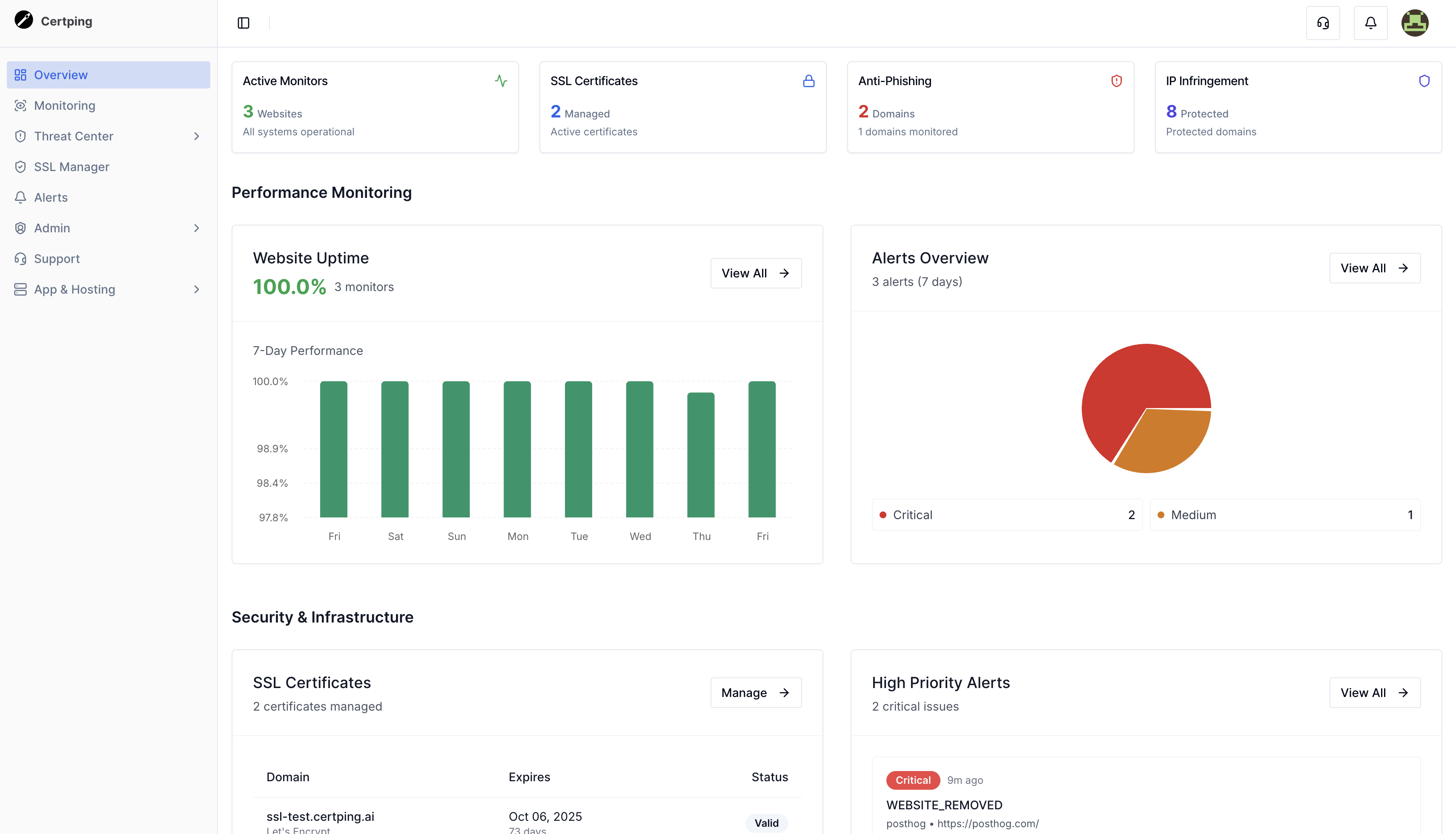 Secure your online presence with CertPing, the AI-native platform for complete website monitoring. We provide uptime checks, SSL automation, status pages, brand protection, and trademark scanning—all in one place.
