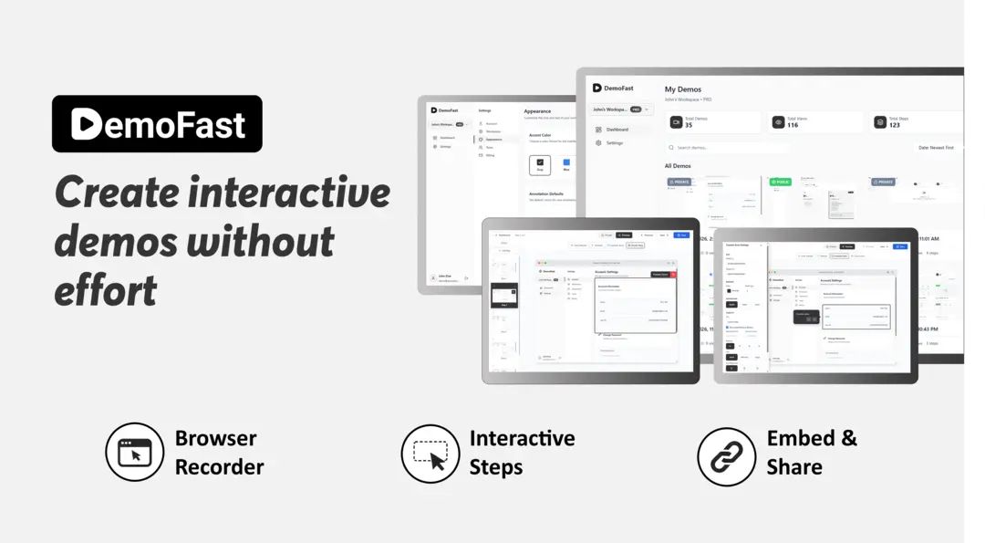 Create stunning interactive product demos without code. Record clicks, add annotations, and share beautiful step-by-step guides. Perfect for SaaS onboarding, sales demos, and product documentation. Free to start.