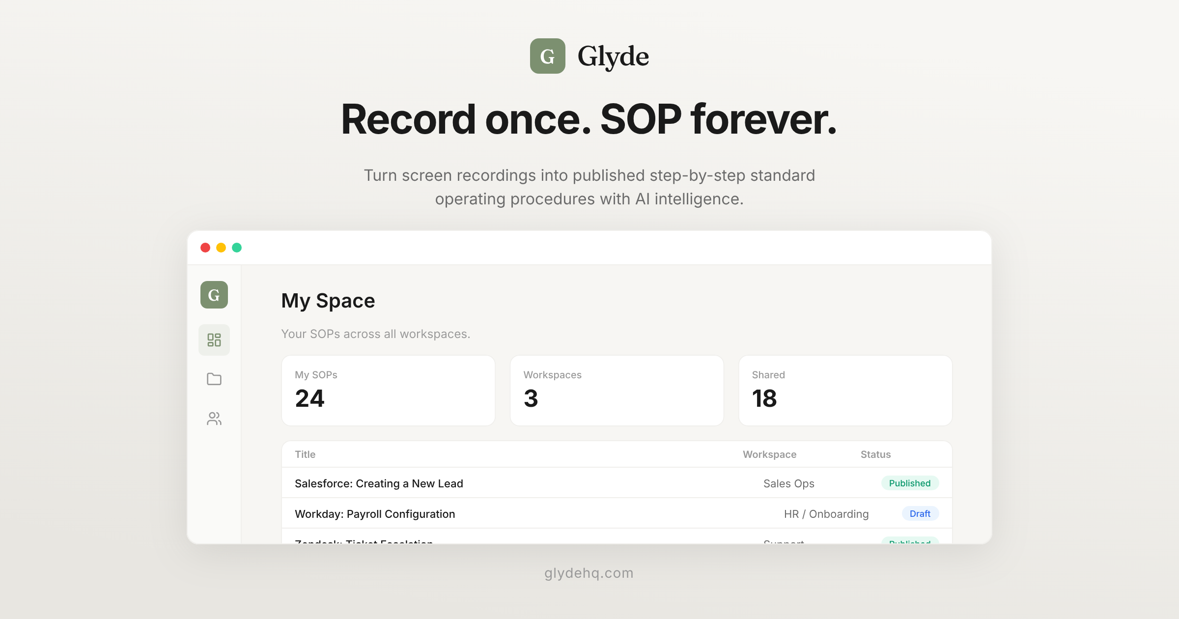 Glyde watches you work and writes a polished, step-by-step procedure. No templates. No editing. Add to Chrome — free.