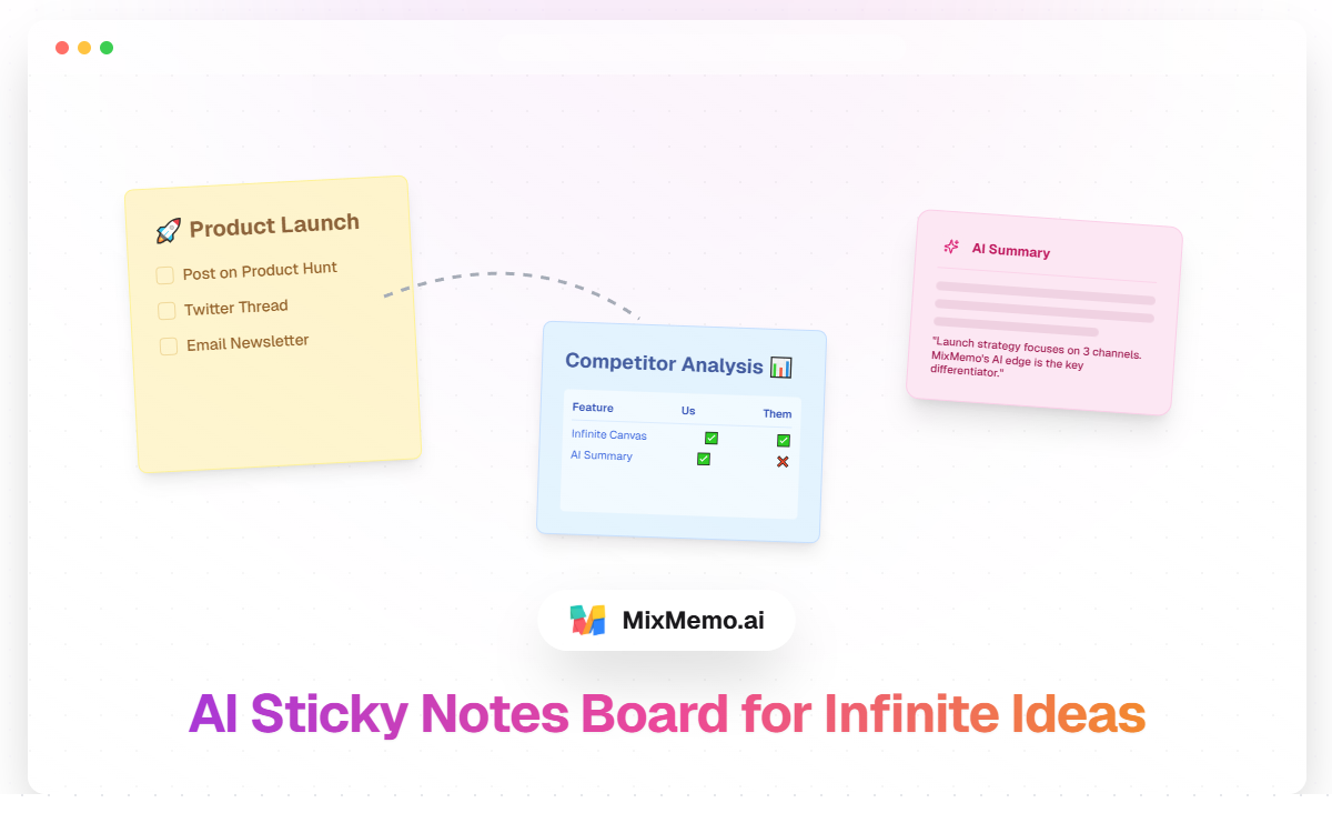 MixMemo is an infinite sticky notes board in your browser with rich text and built-in AI features. All notes are stored ...